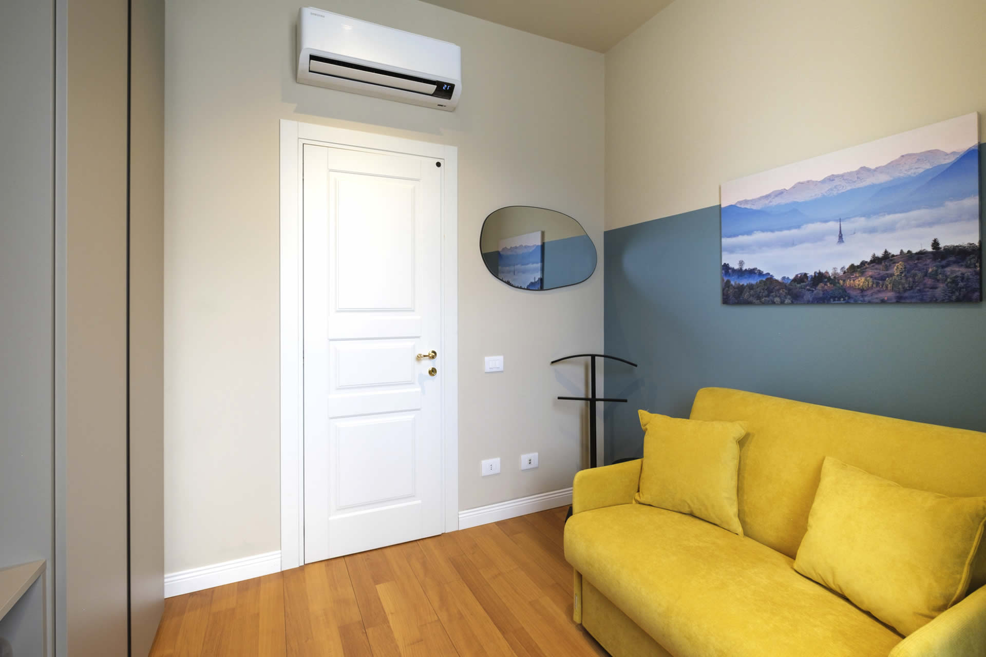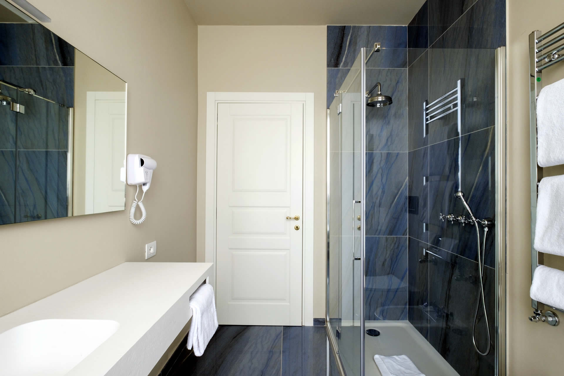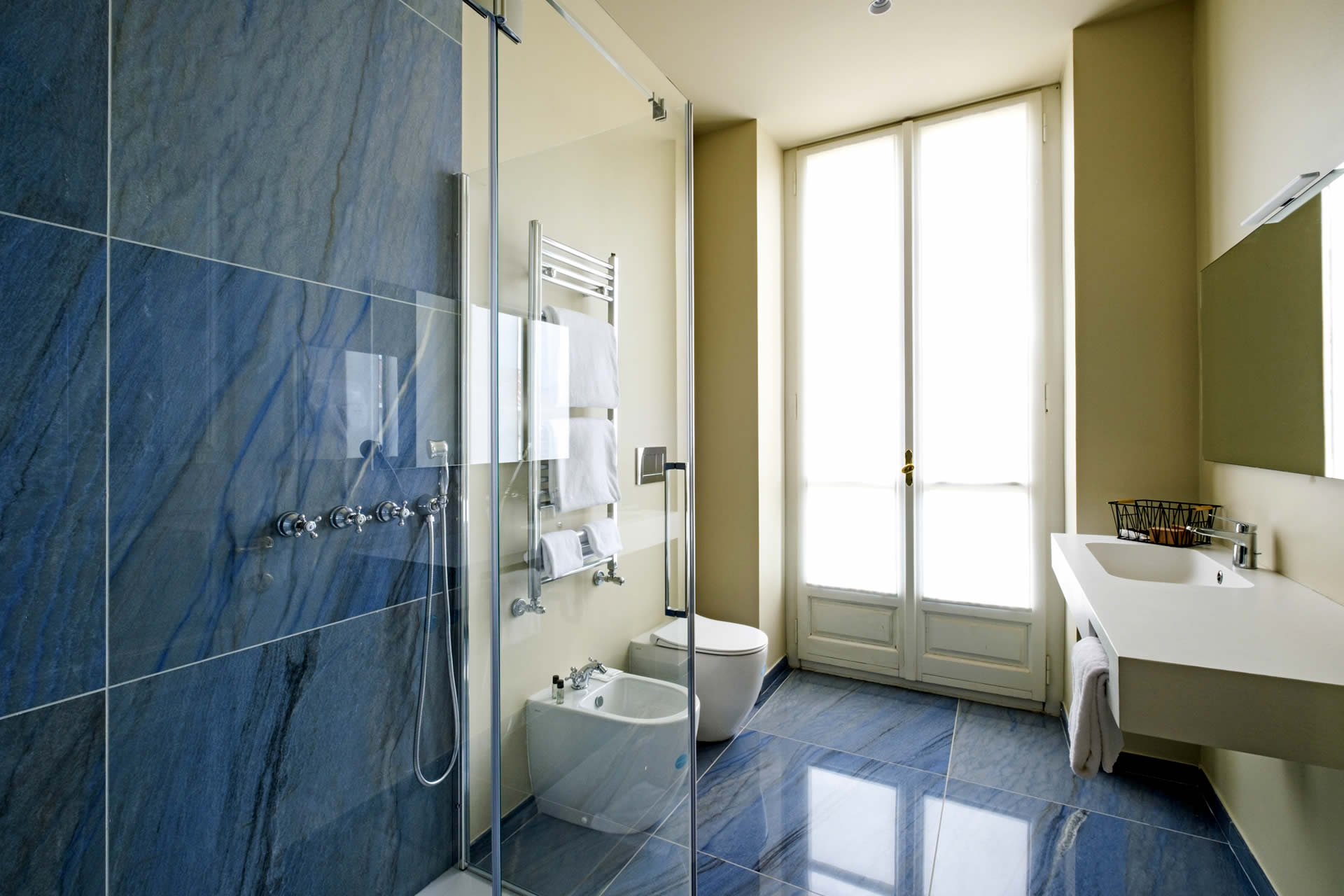 Le pareti, nei toni caldi del celeste e del bianco, avvolgono l'ambiente in un'atmosfera di armonia e sofisticata semplicità. Arredi ricercati e dettagli di pregio completano un soggiorno che coniuga calore ed eleganza. Il grande bagno regala un'esperienza di benessere quotidiano, con una moderna doccia walk-in che invita a lasciarsi avvolgere da un momento di rigenerante relax.